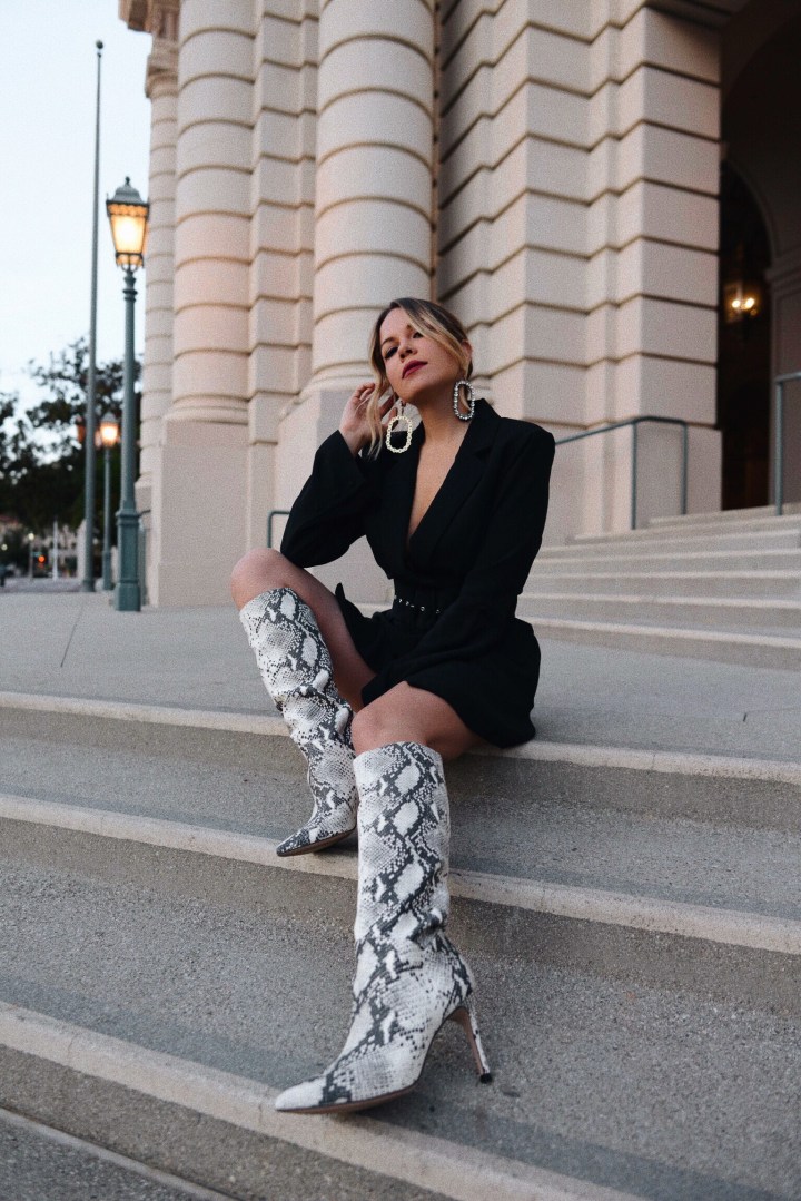 I love the uniqueness of the boots in this look. A classic Black blazer dress combined with snake boots, super trendy!